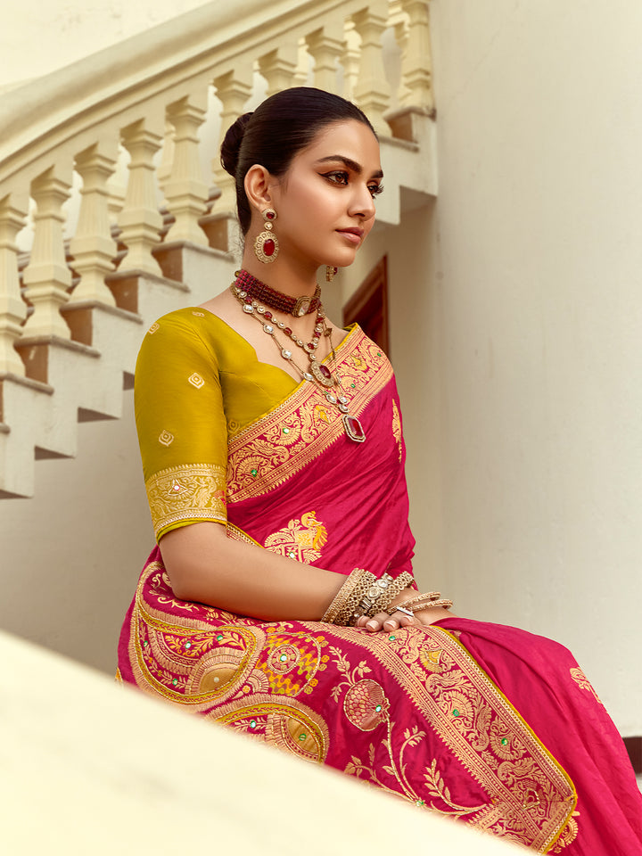 Complementing the saree is a Yellow Designer Blouse featuring full sleeves and intricate back embroidery. This blouse is not just a pairing—it’s a standout piece on its own. Whether you're attending Diwali celebrations or a reception evening, this saree and blouse set guarantees you'll turn heads. Shop now to elevate your festive wardrobe with this premium designer outfit that's trending in 2025 fashion charts.