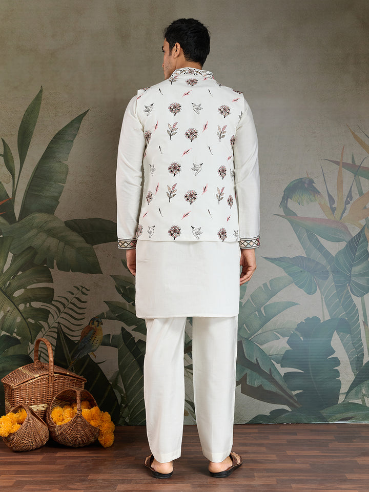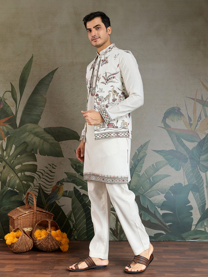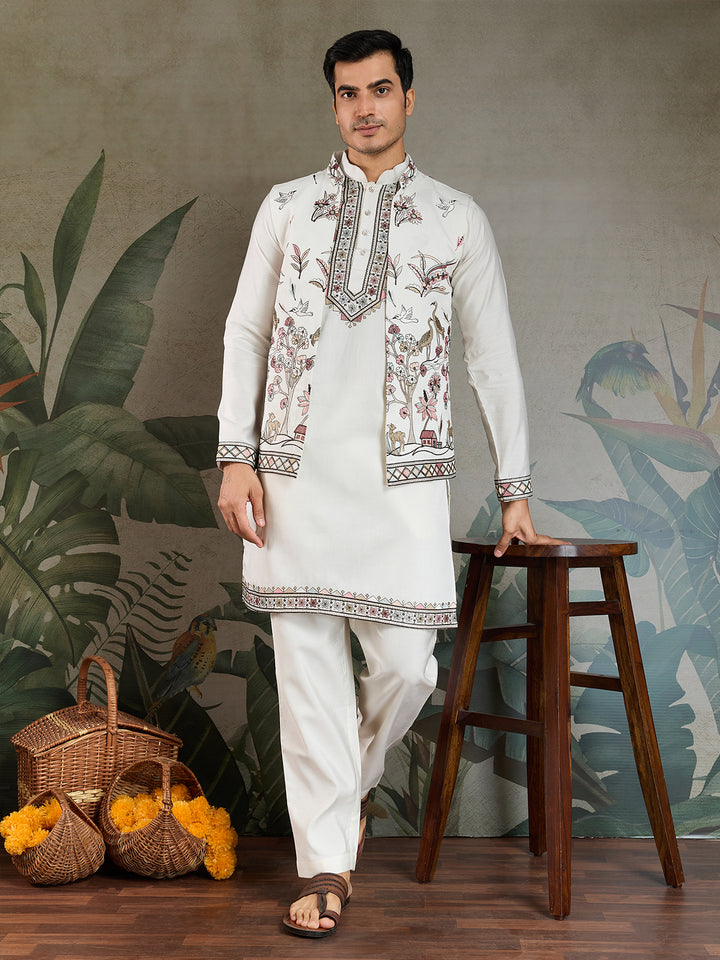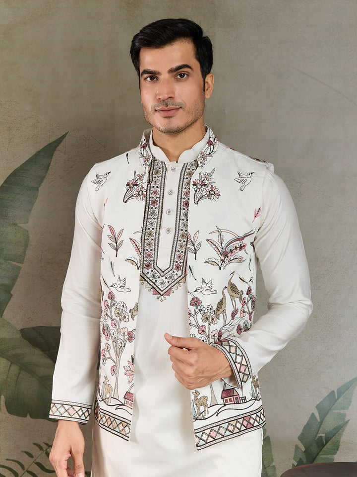 Designer Viscose Silk Men's Wedding Kurta Koti Set In White