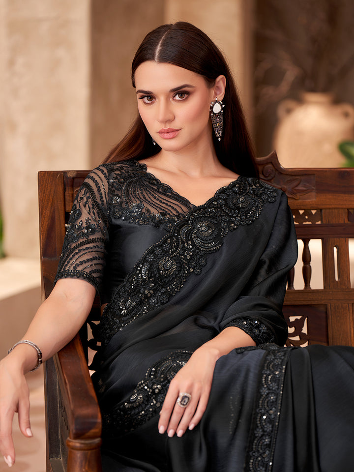 The timeless black hue exudes grace and charm, while the lightweight shiffon fabric offers a breezy and comfortable fit, perfect for long hours of wear. Paired with a luxurious black sartin work blouse, this saree strikes the perfect balance between modern chic and traditional elegance.