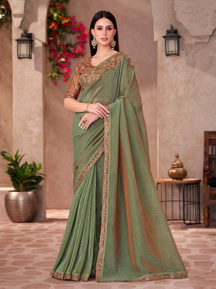 Step into timeless elegance with this stunning green chiffon party wear saree, perfectly designed for festive occasions, weddings, and evening parties. Crafted from lightweight and breathable premium chiffon fabric, this saree flows gracefully, offering a rich drape and a flattering silhouette. The soothing green hue enhances your natural glow, making it a must-have for your ethnic wardrobe.