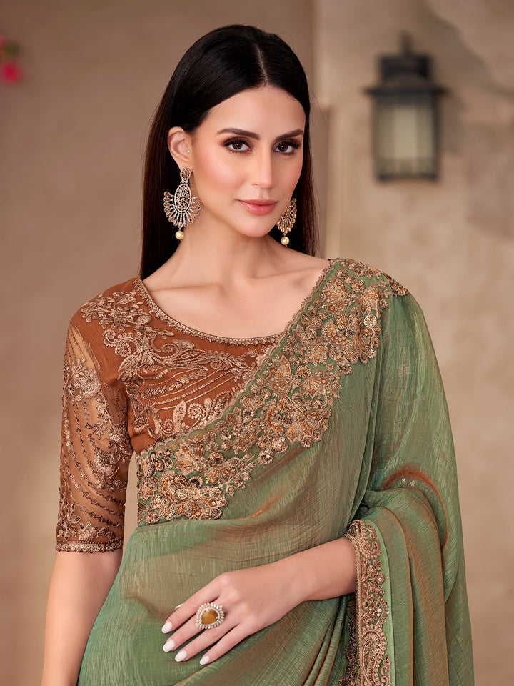 This designer saree comes paired with a luxurious golden chiffon blouse, creating a striking contrast that exudes glamor and sophistication. Whether you're attending a festive celebration or a special event, this chiffon saree with golden blouse ensures you turn heads with every step. Complete your glamorous look with statement earrings and high heels. Add this green and gold party wear saree to your collection and embrace sheer elegance in every detail.