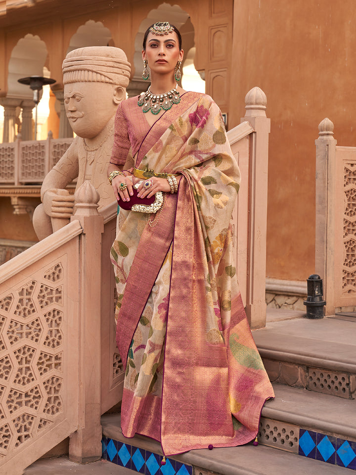 Cream Organza Saree featuring a Jacquard Border and Pallu, adorned with Weaving Jacquard Butti and rich digital prints. The airy and luxurious organza fabric offers a sophisticated silhouette ideal for festival...