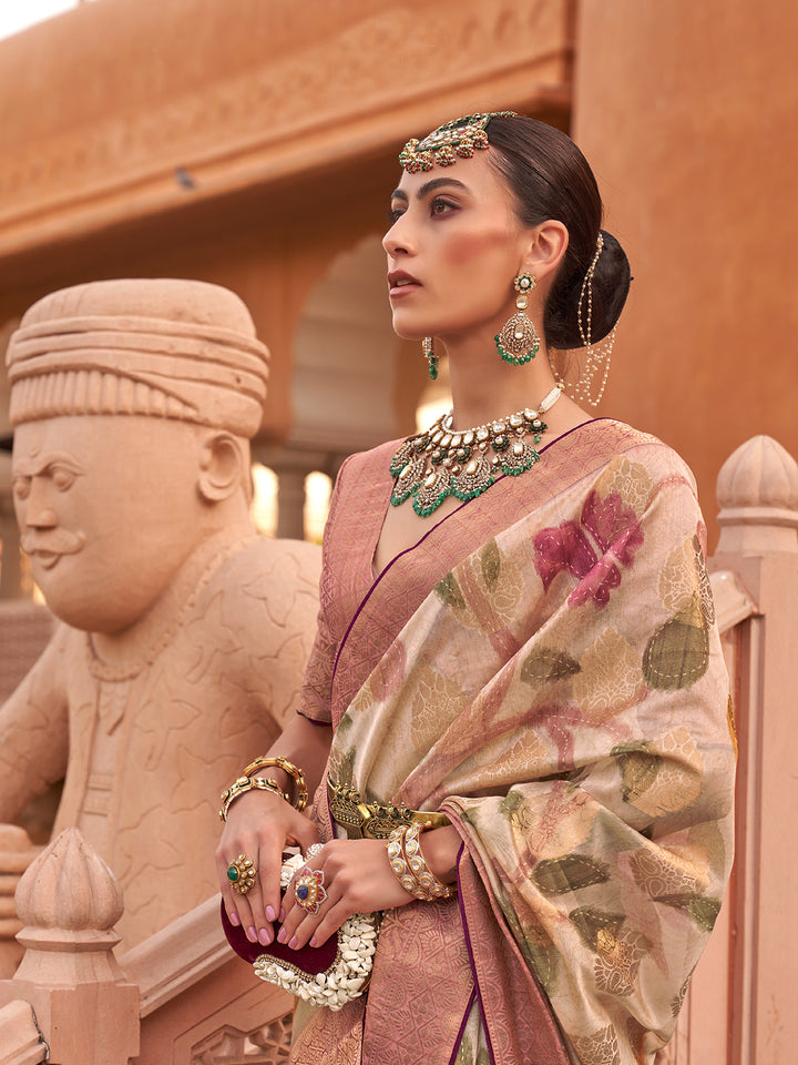 Cream Organza Saree featuring a Jacquard Border and Pallu, adorned with Weaving Jacquard Butti and rich digital prints. The airy and luxurious organza fabric offers a sophisticated silhouette ideal for festival wear, combining tradition and trend effortlessly. The saree’s soft cream hue adds a touch of refined grace, making it a perfect choice for ethnic occasions, pujas, and celebrations.