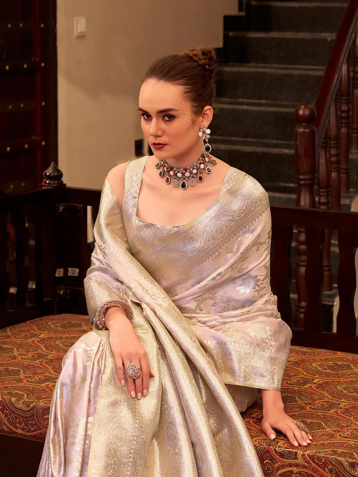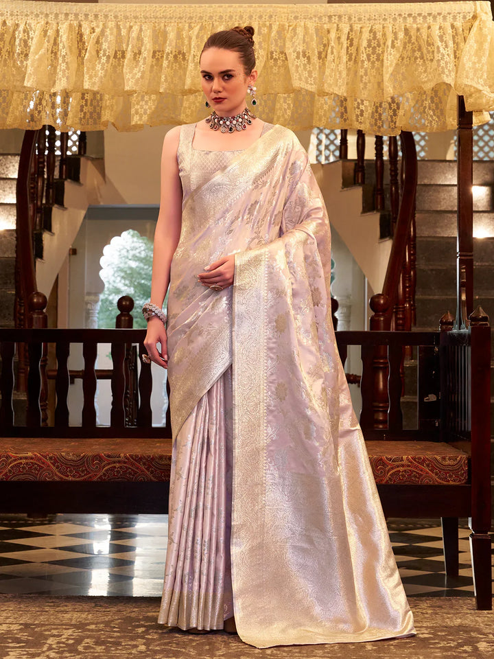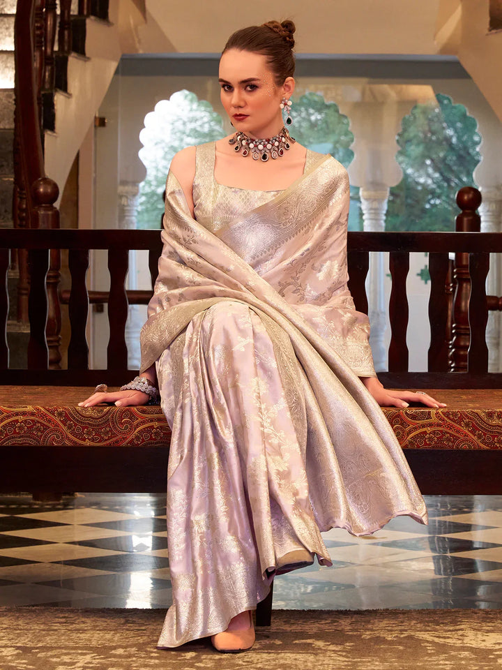 Lavender Satin Silk Saree with Zari Weaving for Festival