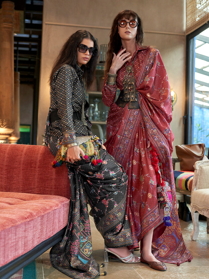 This striking designer red silk saree comes complete with a perfectly matching unstitched blouse piece in the same fine silk fabric and rich red hue. This monochromatic pairing allows for seamless tailoring to your personal style, offering a cohesive and opulent traditional outfit. Experience the blend of classic silk craftsmanship and modern print luxury, securing your place as the best-dressed guest. Shop this wedding-ready red silk sari online now to embrace authentic Indian elegance and achieve an effortlessly glamorous festive look.