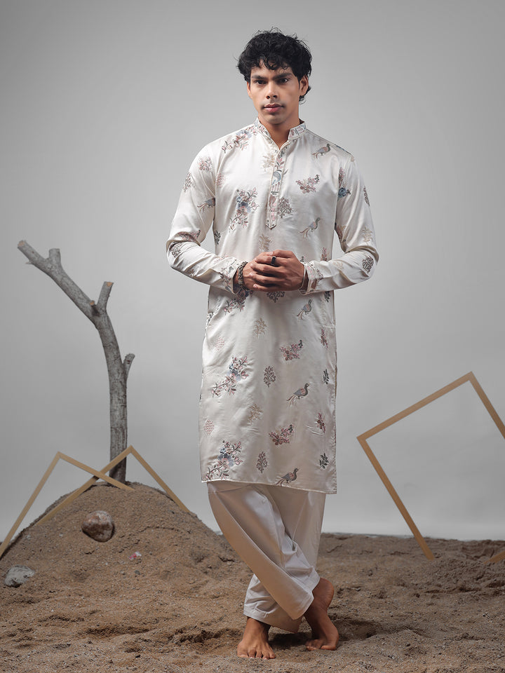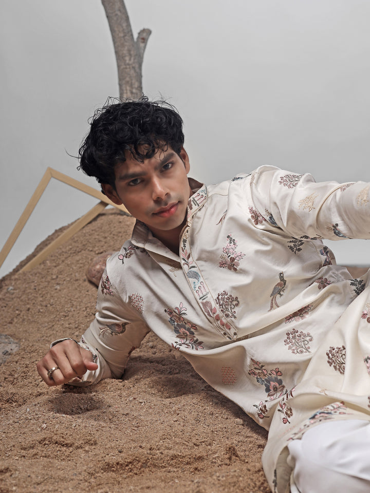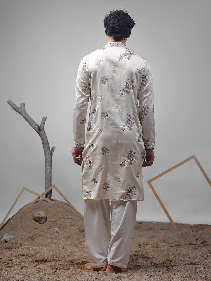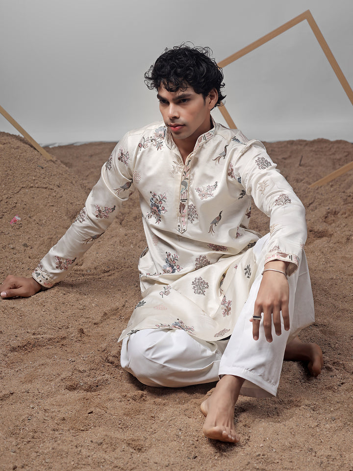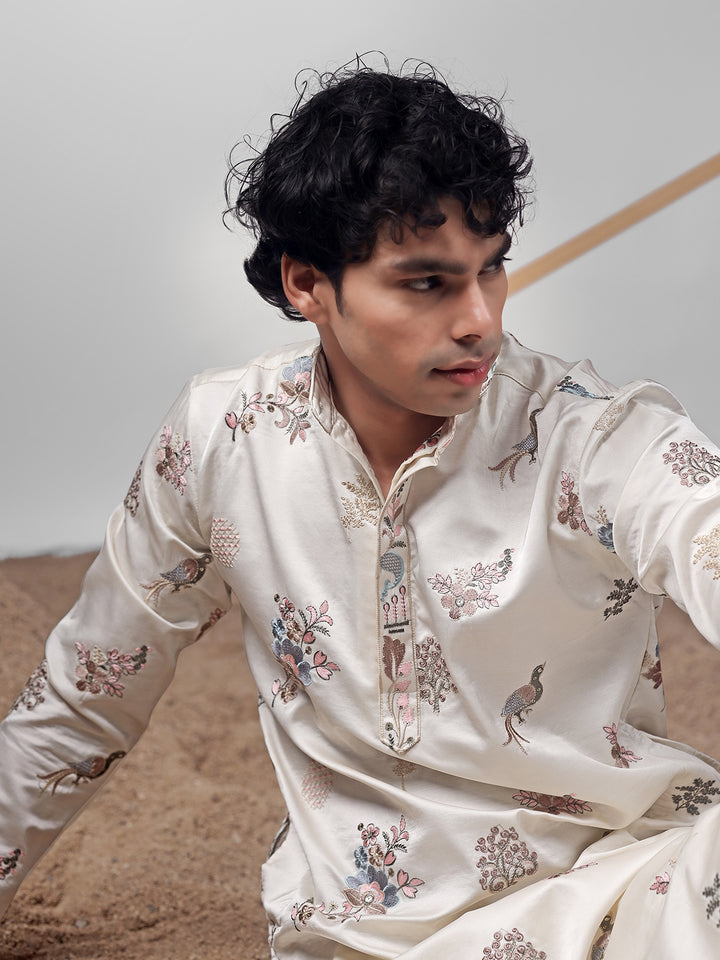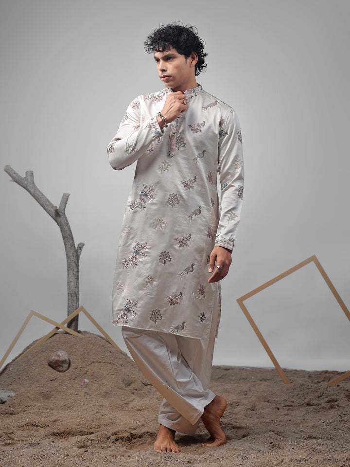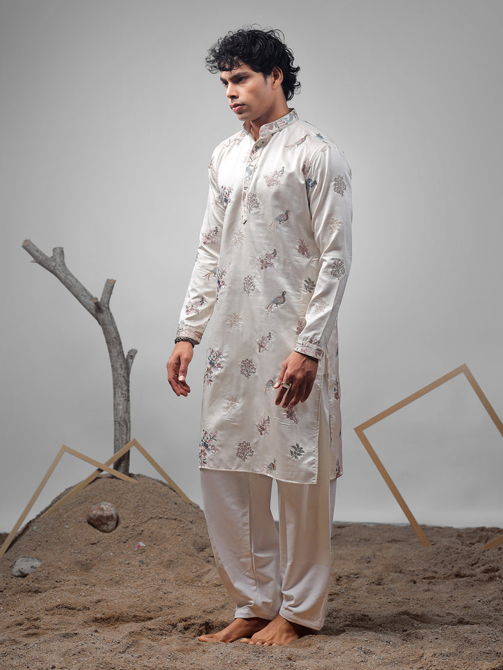 Off-White Silk Kurta Set for Men In Embroidery & Weaving Work