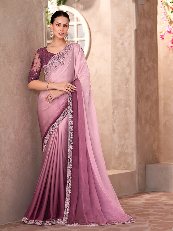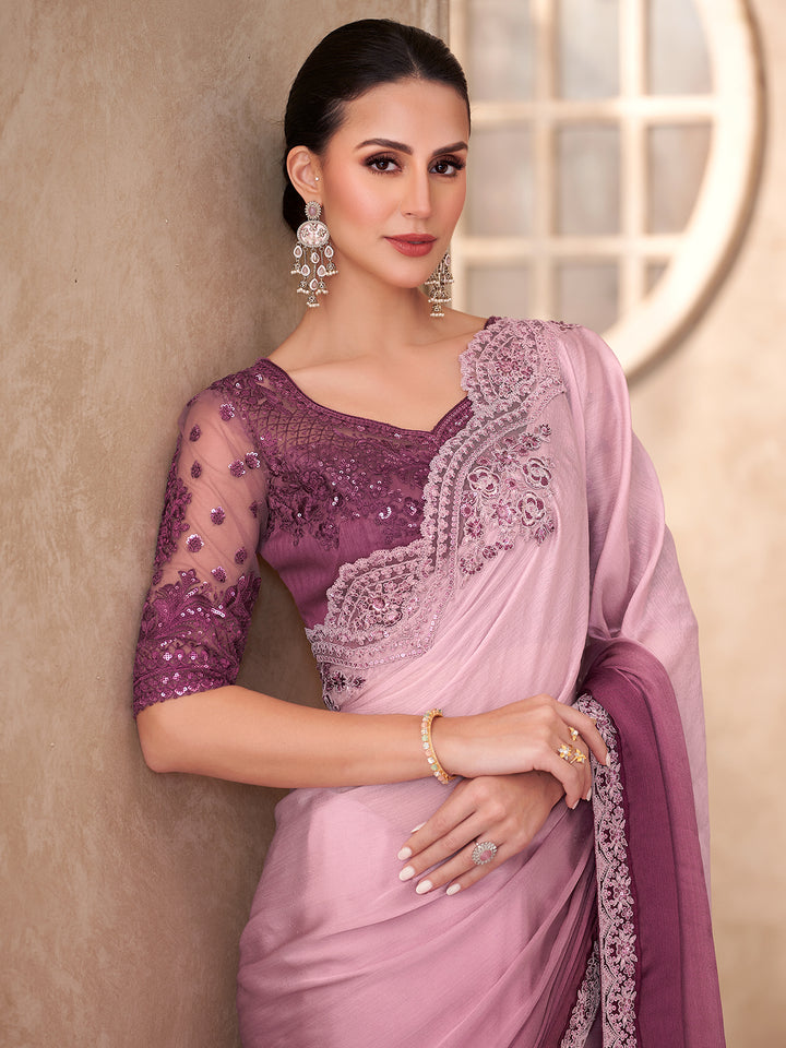 Elegant Pink Chiffon Party Wear Saree with Purple Linen Blouse – Trending Designer Saree for Women