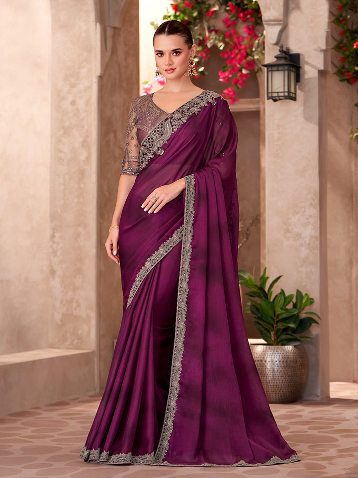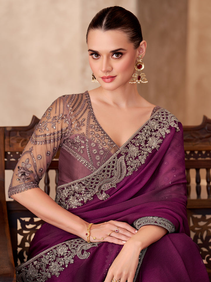 Purple Chiffon Party Wear Saree with Grey Sartin Blouse