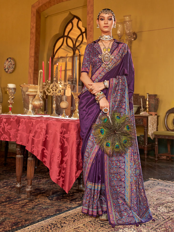 Step into elegance with our Purple Silk Saree featuring a luxurious print and glory finish, designed to capture attention at every celebration. This premium silk saree showcases rich purple hues that symbolize royalty and grace, making it the perfect outfit for both festival wear and party occasions. Whether it's Diwali, weddings, or evening functions, this saree will elevate your style with a timeless appeal. The luxury print with a silky smooth texture exudes sophistication, offering a flawless drape and refined look for modern women who love traditional charm.