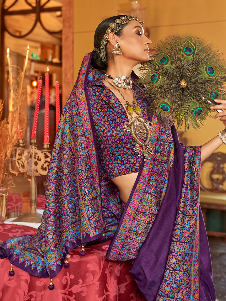 The matching purple silk blouse adds balance and grace, crafted from high-quality fabric for ultimate comfort and durability. Pair it with statement earrings and a clutch for a complete ethnic ensemble. Ideal for festive gatherings or high-end events, this saree is a standout piece in any fashion-forward wardrobe.