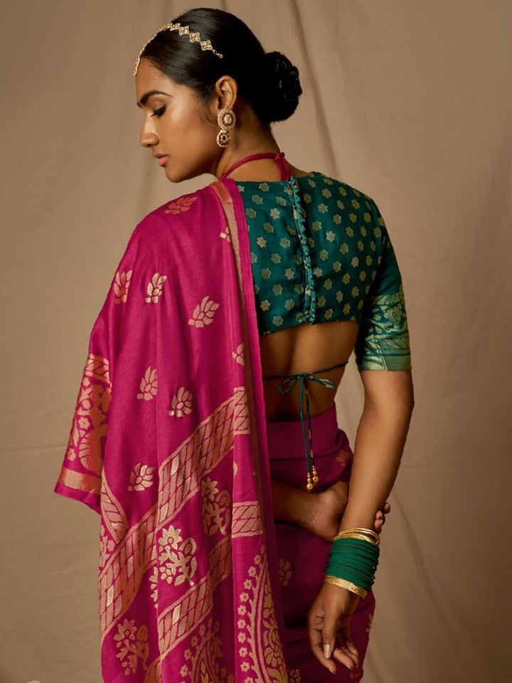 Paired with a contrasting Green Silk Blouse adorned with foil print, this ensemble strikes the perfect balance between heritage and contemporary flair. The vibrant color contrast ensures a bold and festive look that photographs beautifully. Whether you're the bride, bridesmaid, or a graceful guest, this designer silk saree with foil print blouse is your go-to for a high-style, culturally rich celebration.