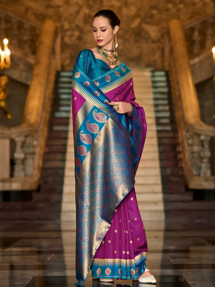 Royal Purple Silk Saree with Contrast Zari Border & Blue Blouse – Festival Wear Elegance