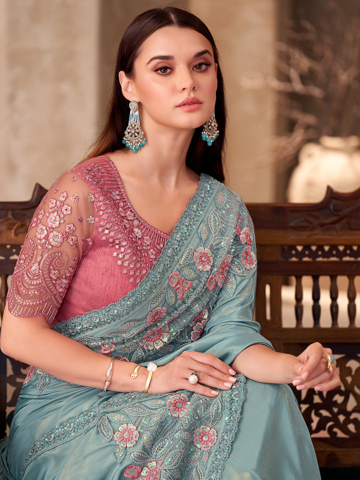 Sky Blue Silk Party Wear Saree with Pink Linen Blouse