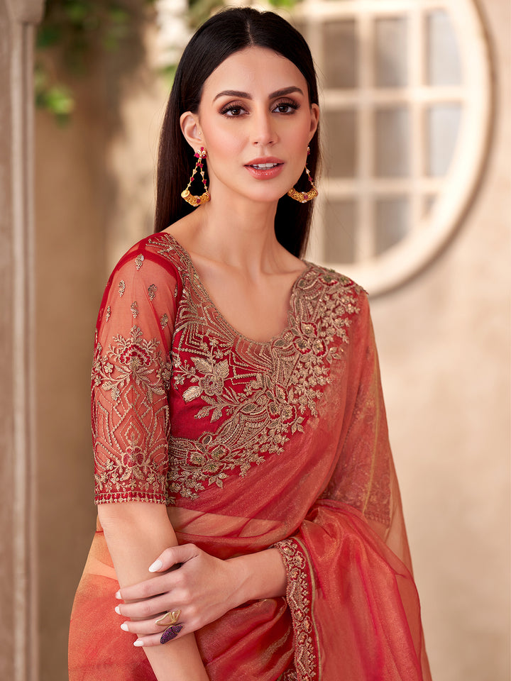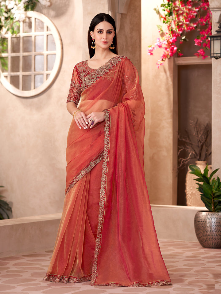 Step into elegance with this luxurious Terracotta Tissue Saree, specially curated for party wear and festive occasions. Crafted from premium tissue fabric, this saree showcases a luminous, airy drape that effortlessly blends tradition with trend. The warm terracotta hue, inspired by earthy sophistication, complements a wide range of skin tones and is trending this season for festive and evening wear. Whether it’s a wedding, cocktail party, or celebration, this saree ensures you shine with every step.