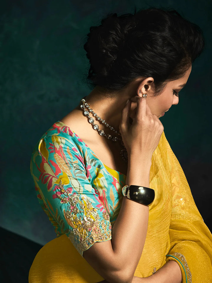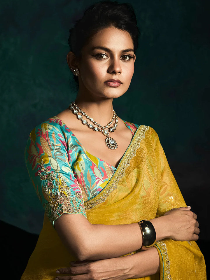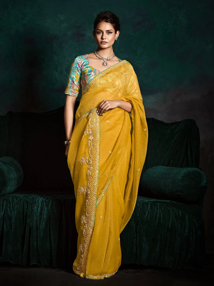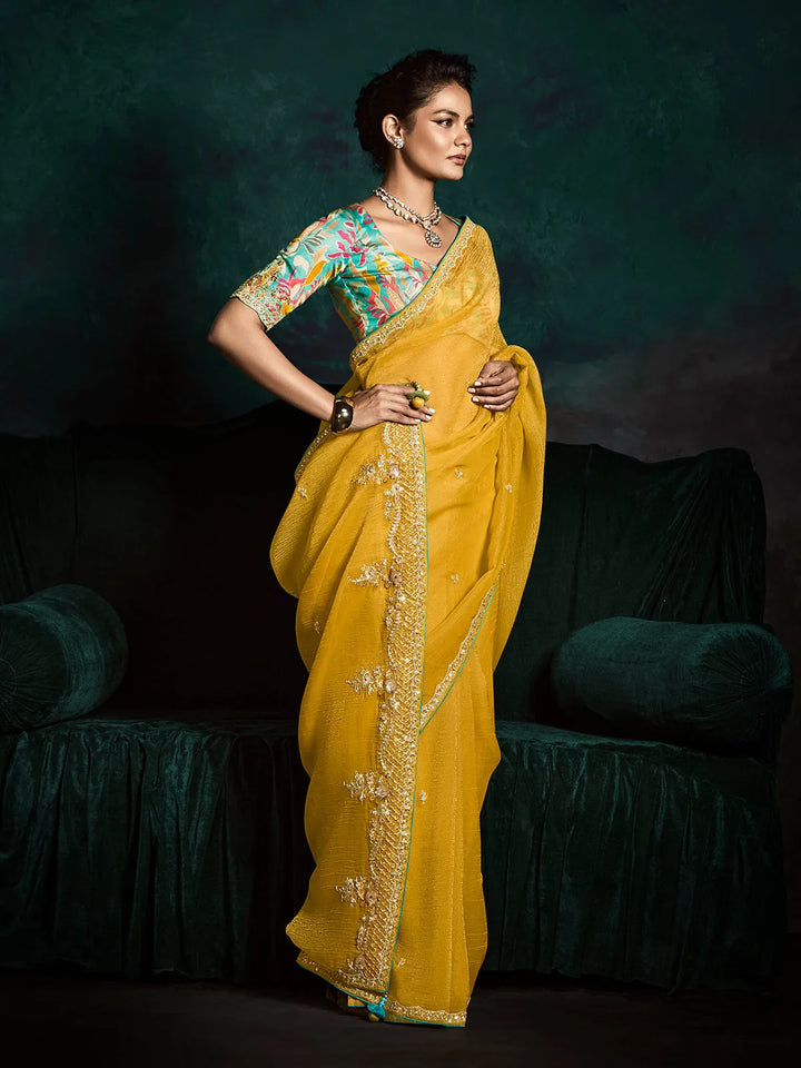 Yellow Fancy Designer Haldi Saree with Thread Embroidery