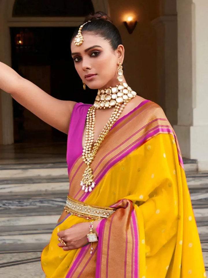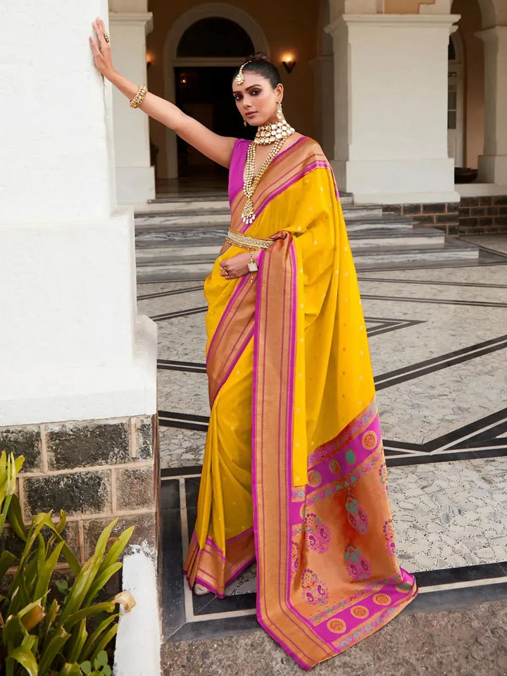 Yellow Paithani Silk Saree With Pink Blouse For Any Occation