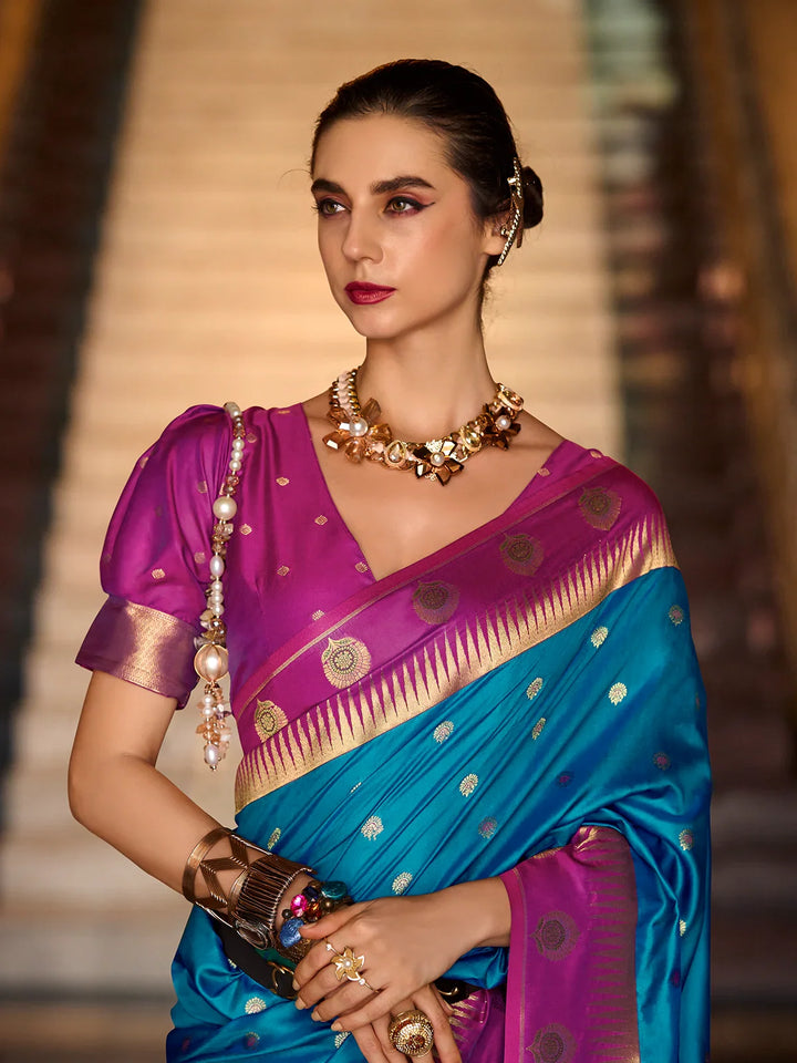 Celebrate timeless tradition with our Royal Blue Silk Saree featuring a Contrasting Purple Blouse, exquisitely crafted for festival wear. Designed in premium silk fabric, this saree is enhanced with elegant zari weaving work and a bold contrast border, delivering a majestic charm that’s perfect for festive gatherings, religious ceremonies, and cultural celebrations. The striking blend of royal blue and purple radiates regal elegance, ideal for the modern woman who cherishes heritage fashion with a contemporary flair.